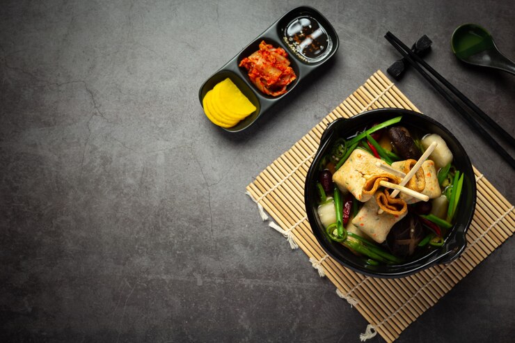 • Teokbokki is a dish with spicy rice cake in a thick red chutney.